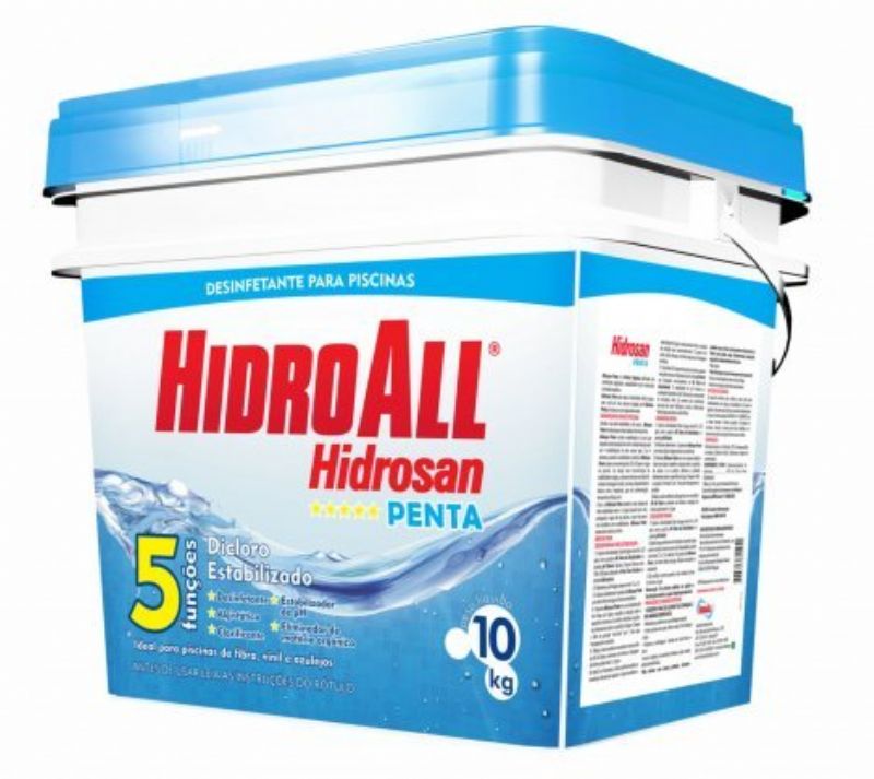 Hidrosan Penta é o Dicloro Orgânico aditivado com clarificante, algistático, estabilizador de pH e eliminador de matéria orgânica. Indicado para tratar qualquer tipo de piscina, Hidrosan Penta não reduz a alcalinidade e nem o pH da água. Por isso, piscinas tratadas com Hidrosan Penta permanecem com a água balanceada.Hidrosan Penta contém estabilizador de cloro que impede a decomposição do cloro residual da água pelo sol. Dessa forma o cloro residual se mantém estabilizado entre 1 e 3 ppm durante todo o dia, protegendo a água da piscina. Isto não ocorre com produtos sem estabilizantes.