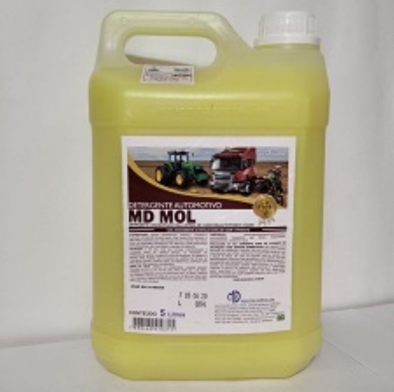 É um detergente biodegradável concentrado, e levemente alcalino, indicado para limpeza de substâncias orgânicas e inorgânicas tais como terra, encardido, óleo, graxa de vidros, pinturas, motores, chassis, carrocerias de madeiras, carrocerias metálicas (baús) de veículos em geral. Na lavagem de vidros e latarias dissolver 1 litro do MD Mol para até 150 litros de água; na lavagem de motor, chassis, rodas, pneus, carrocerias de madeira e baús